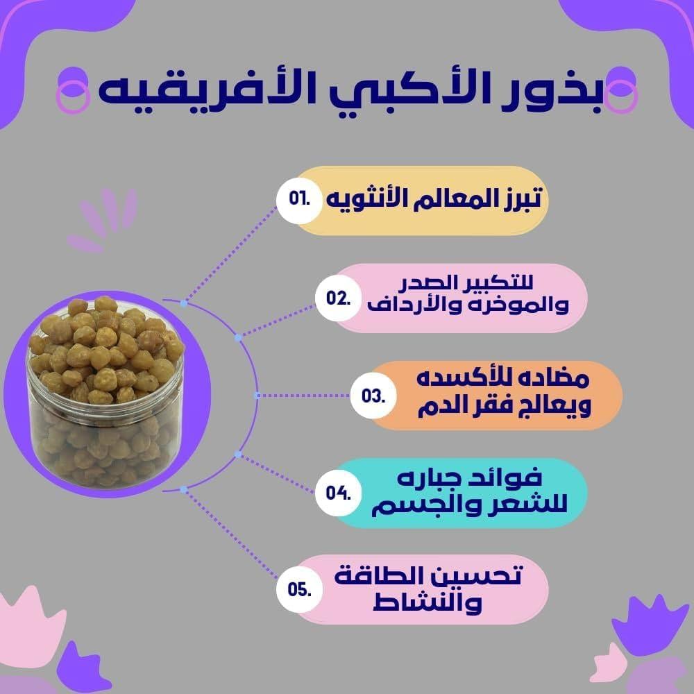 بذور الأكبي الإفريقية تُعتبر من المكونات الطبيعية التي تحتوي على نسبة عالية من الدهون الصحية والبروتينات، وهذا ما جعل البعض يربطها بتعزيز المناطق الأنثوية مثل الخصر والأرداف. في بعض الثقافات الإفريقية، يُعتقد أن بذور الأكبي يمكن أن تساهم في زيادة الوزن أو تحفيز نمو العضلات في مناطق معينة من الجسم بسبب غناها بالعناصر الغذائية.