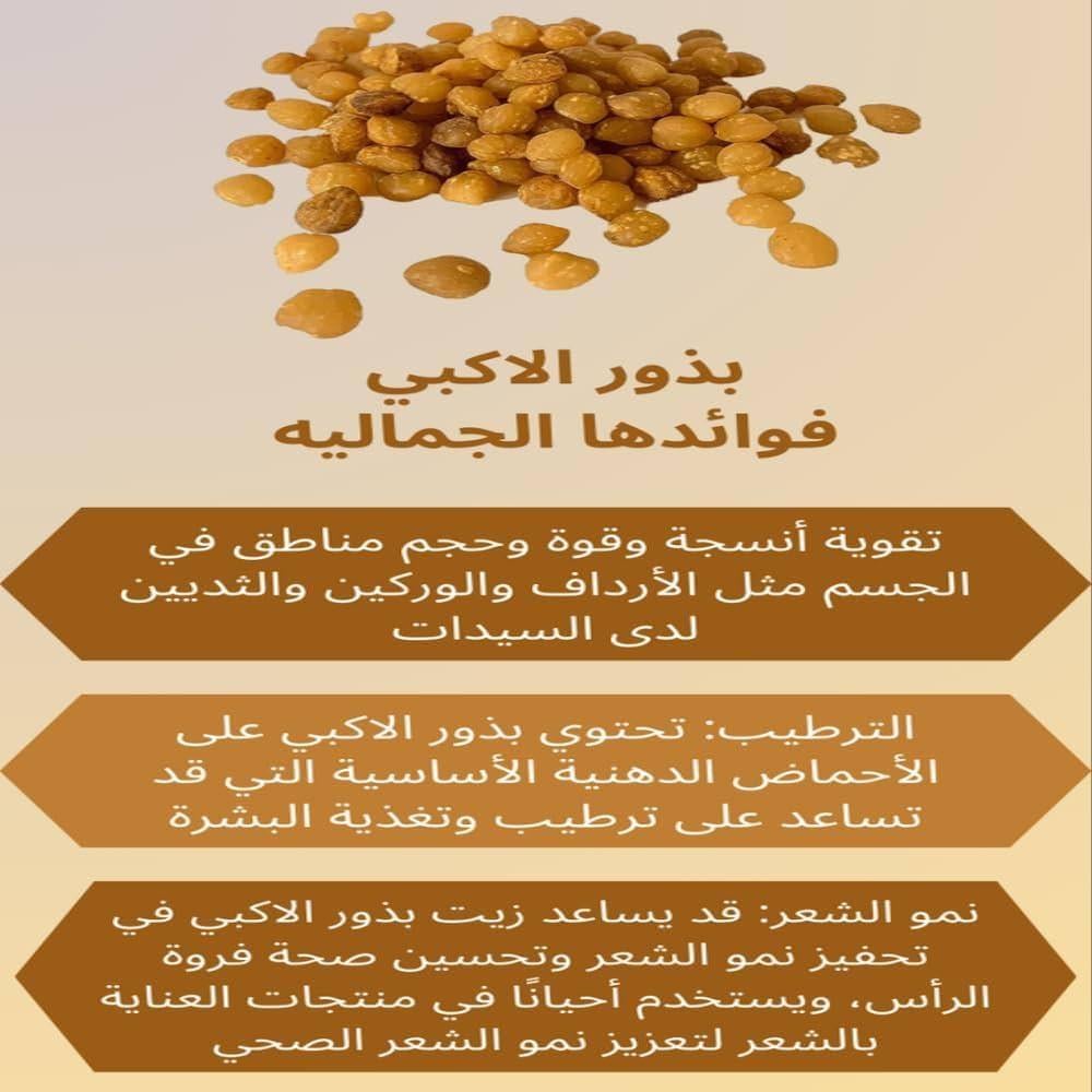 بفضل احتوائها على الدهون الصحية والمعادن، يمكن أن تساهم بذور الأكبي في تحسين صحة البشرة وترطيبها، كما يمكن استخدامها لتغذية الشعر وتقويته.