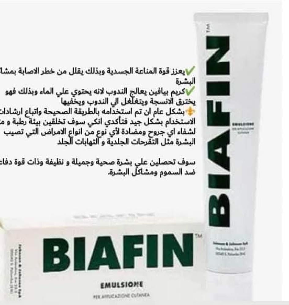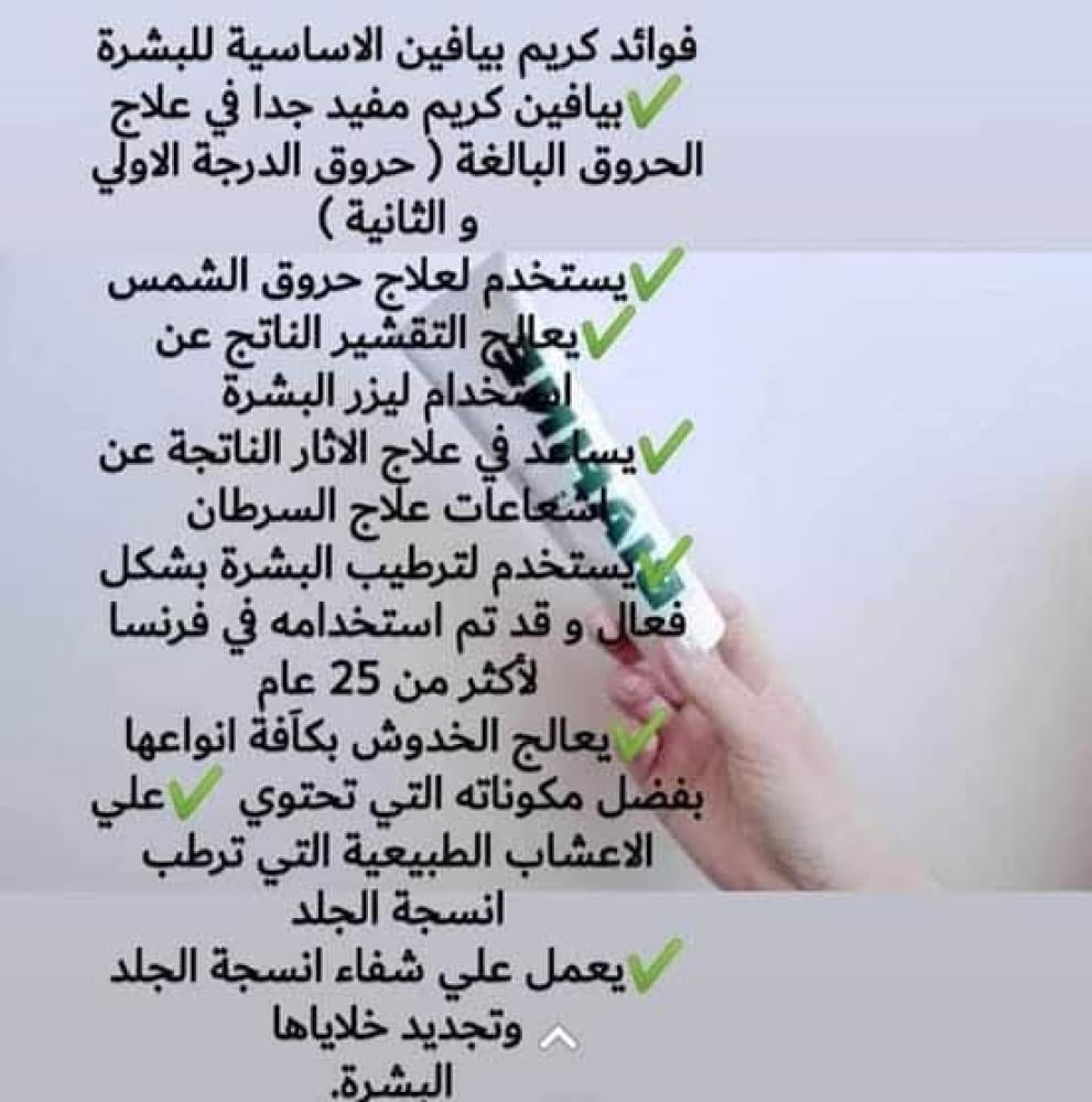 كريم بيافين هو منتج فعال للعناية بالبشرة يتميز بتركيبة فريدة تحتوي على مكونات مهدئة ومرطبة يتألف من مجموعة من المكونات النشطة مثل الزنك والثيامين والهايلورونيك اسيد التي تعمل على ترطيب الجلد وتهدئتة . يعمل الكريم على تقليل الالتهابات وتحسين عملية الشفاء للبشرة المتضررة من احروق البسيطة والتهيجات الجلدية والجروح السطحية والحروق الشمسية .